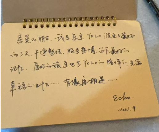 宿泊客のEcho氏が寄せた直筆のメッセージには、