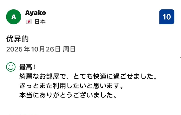 「親愛なる友へ、東京YOLOで過ごした3日間は素晴らしいものでした。清潔で、サービスも温かく、心に残る滞りとなりました……」