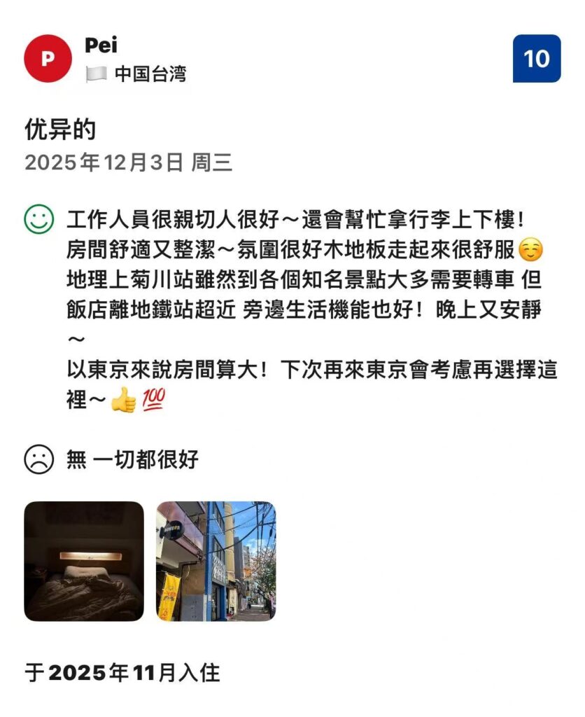 2025年11月、台湾からのお客様Pei様は、満点の評価と共にこう書いてくれました。
