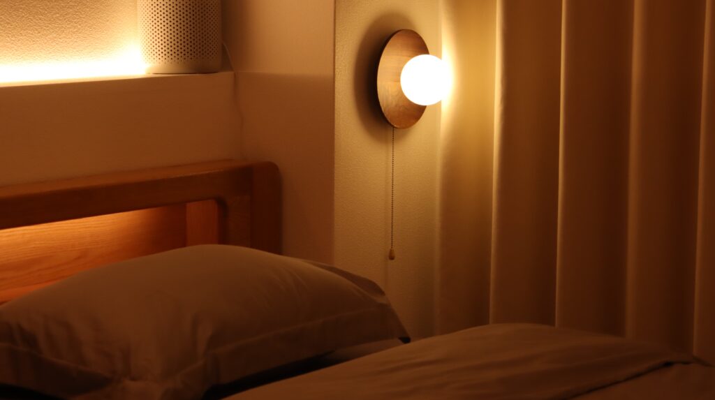 壁面の木製ブラケットライトの暖かな光が、ちょうどベッドを優しく照らします。