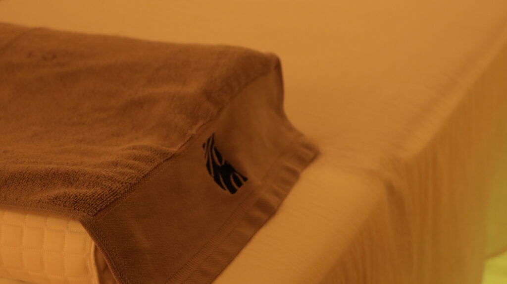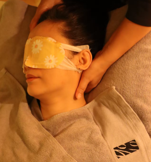 柔らかなトリートメントベッドに横たわり、アイマスクをした瞬間